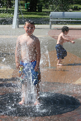 On Monday, we met Rachel & Ares at Riverside Park to go through the fountains. When we got there though, the fountains were turned off. :0( Luckily, there is a playground right next to the fountains!