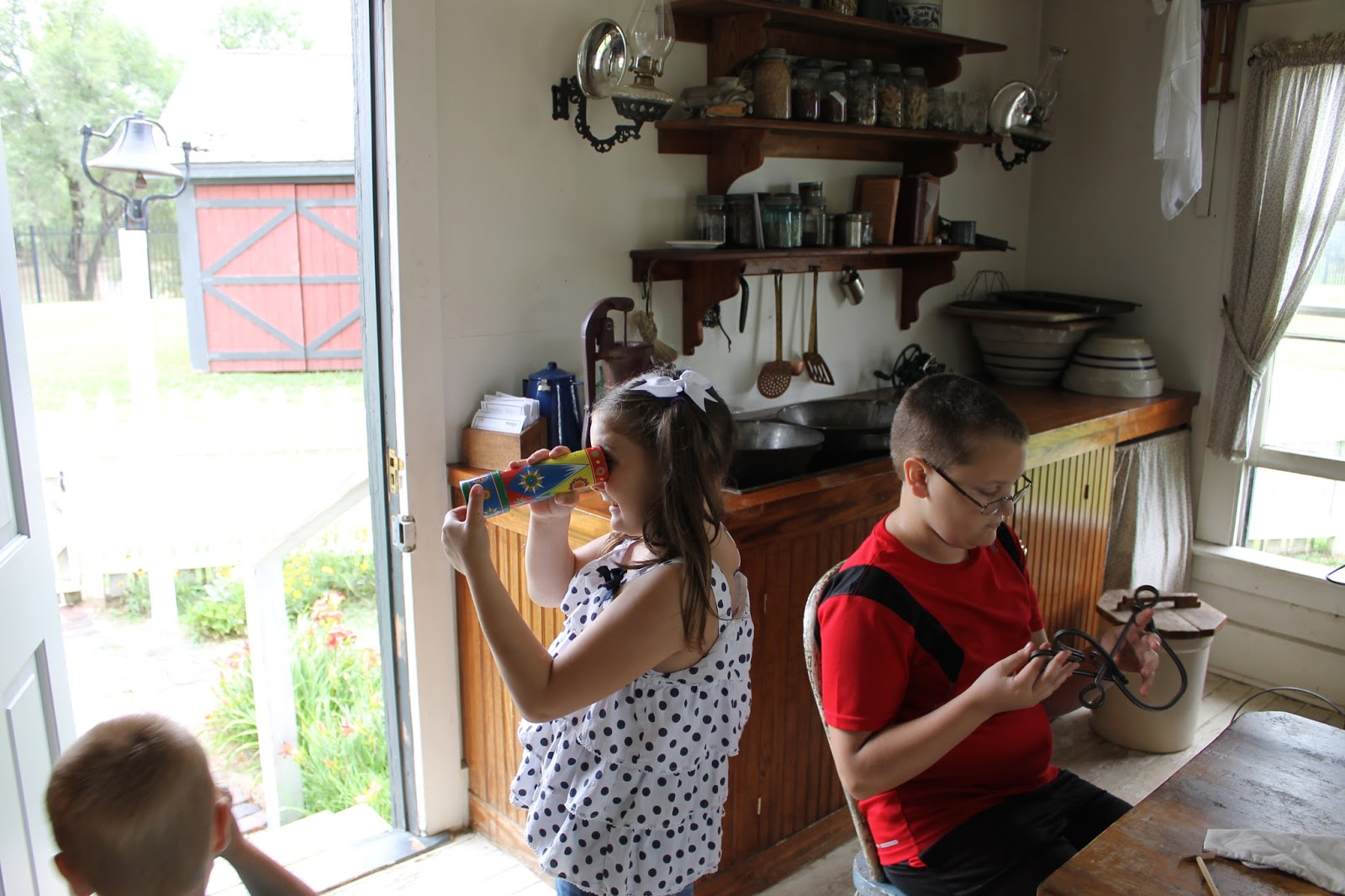 Our next stop was the farm house. All the kids got to try out different things that would be available to them in the 1800's. They got to play games with the hoops and sticks....